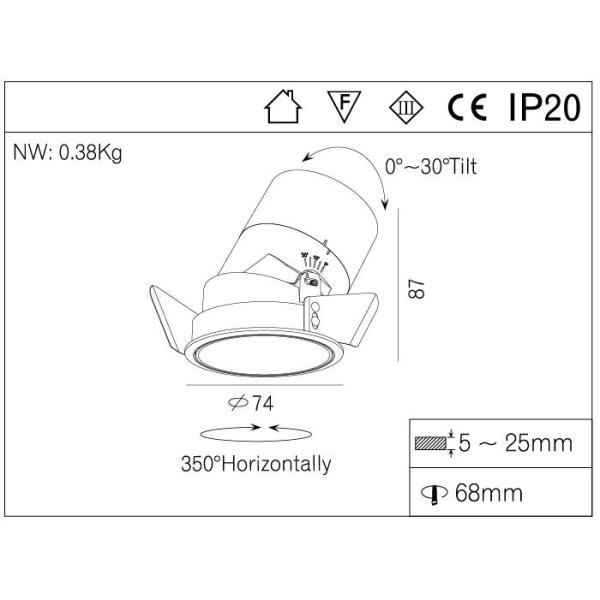 | Light source | Citizen COB LED | Size | Dia.74*88 mm Cutout dia.68mm |